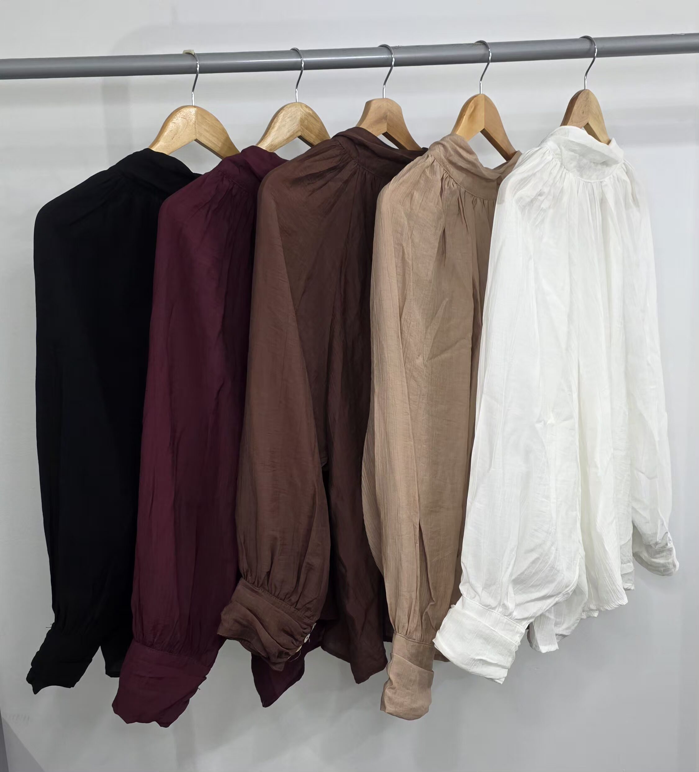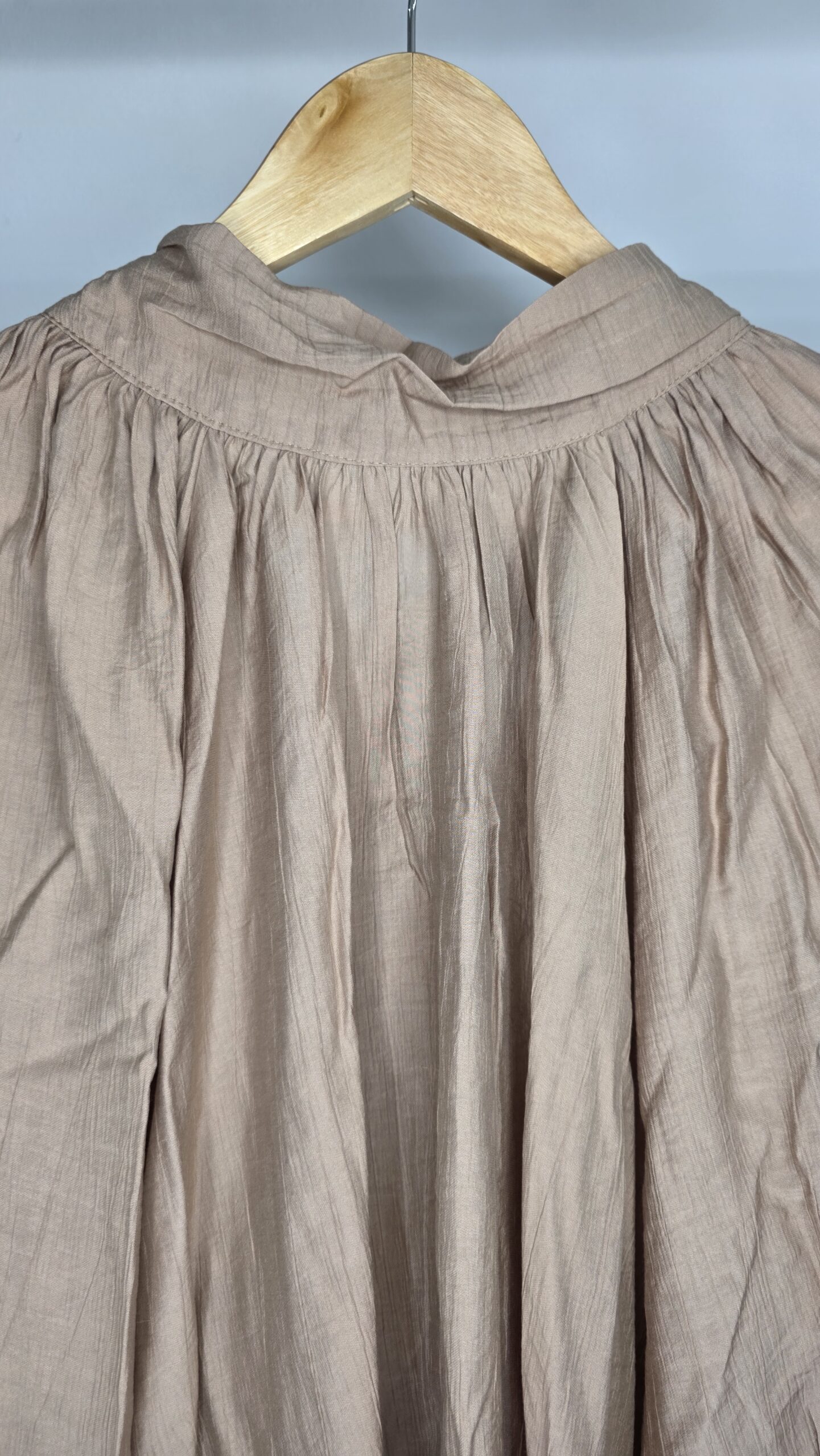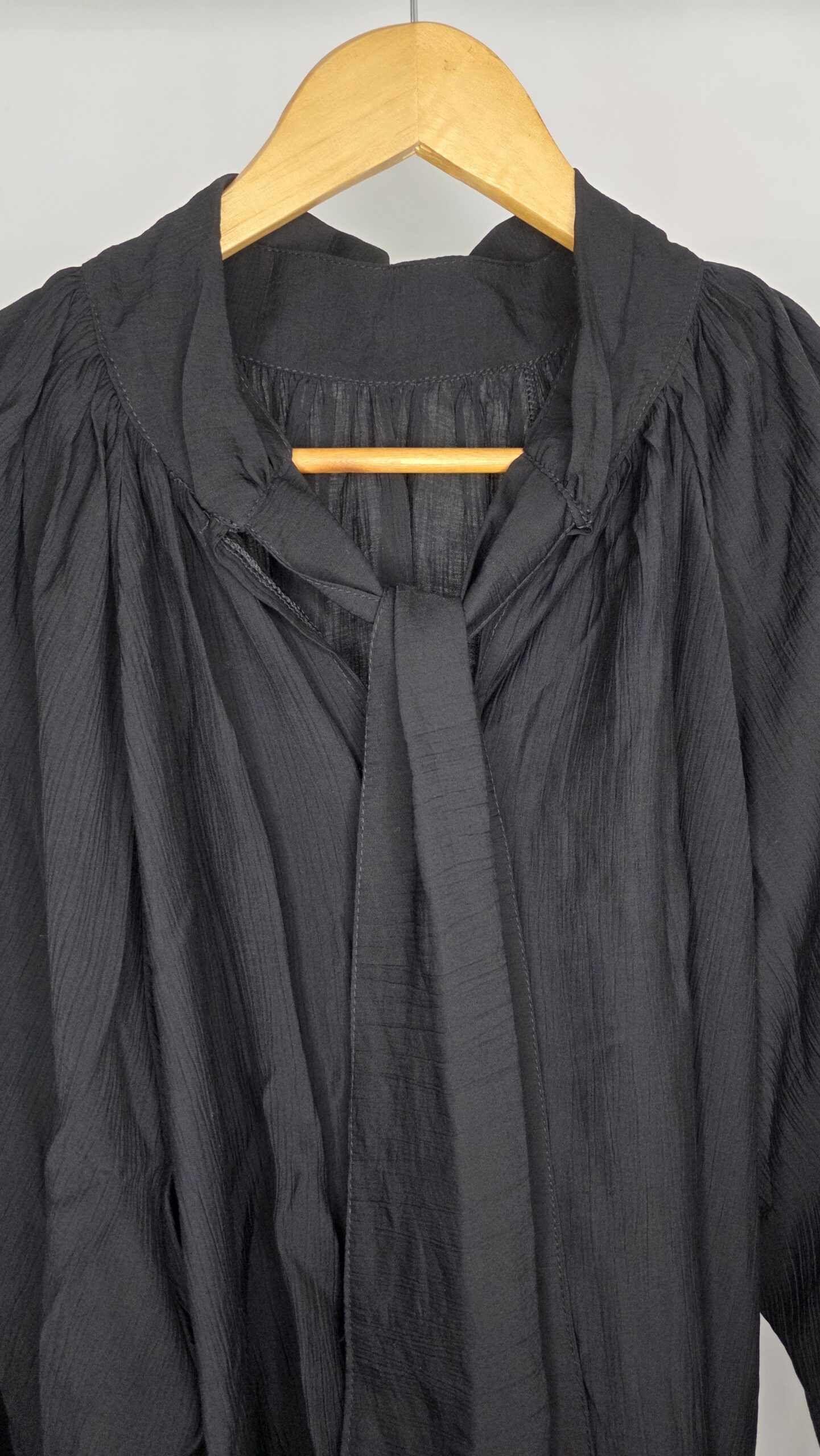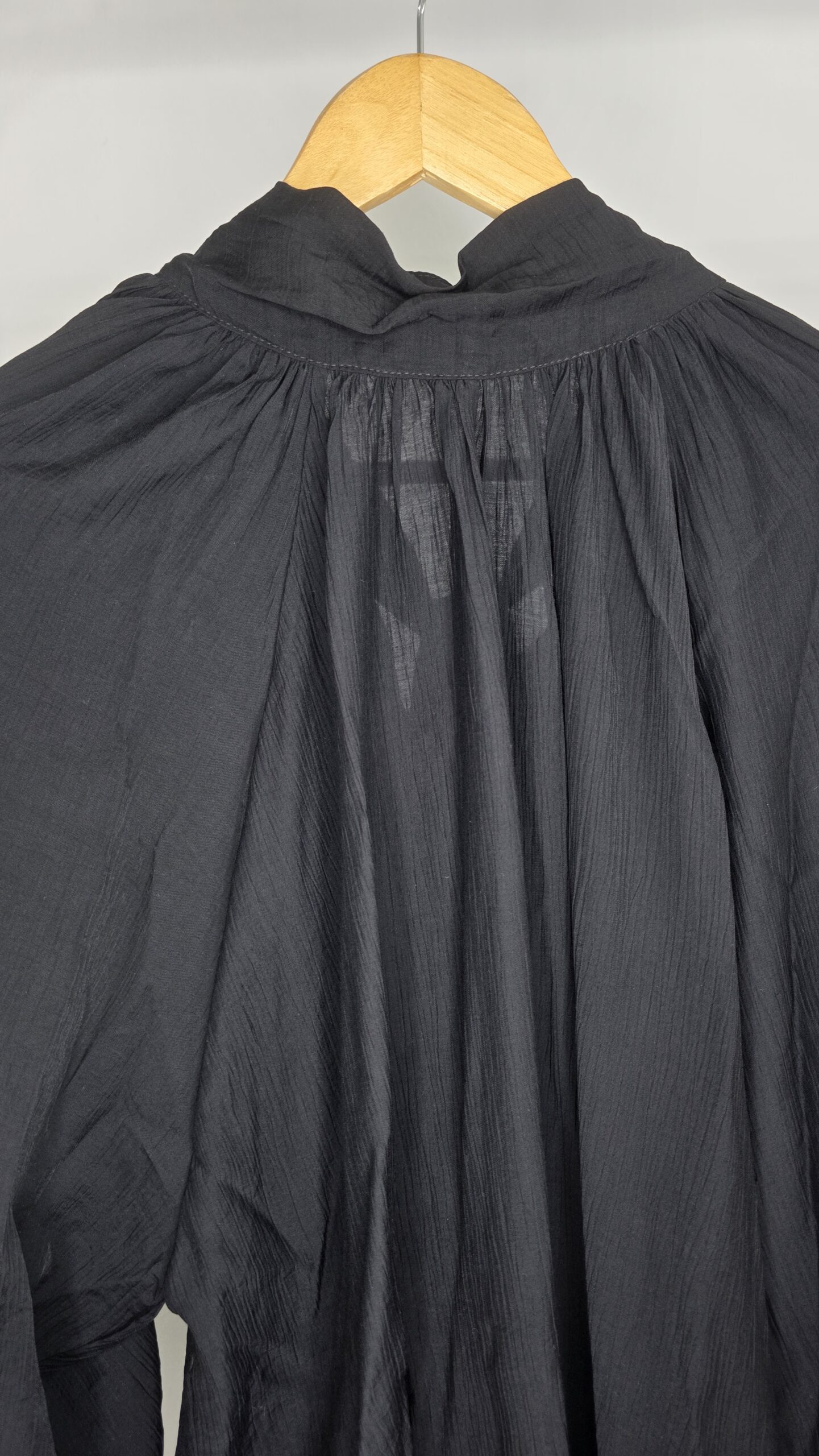 Blusa tela seda rayón,cuello media polera,mangas amplias con botones de nácar,lazo en la espalda,corte evasé,amplia
