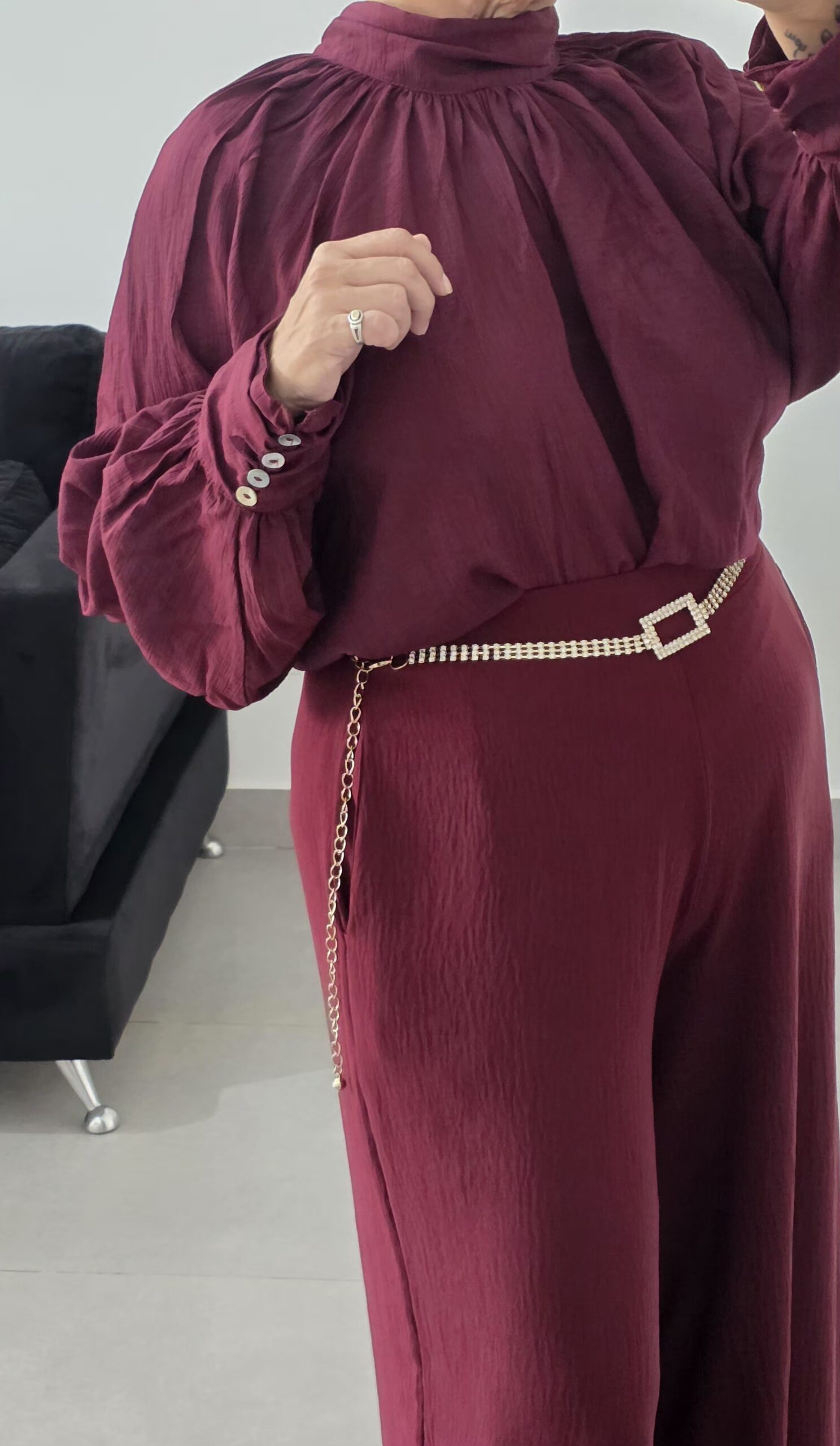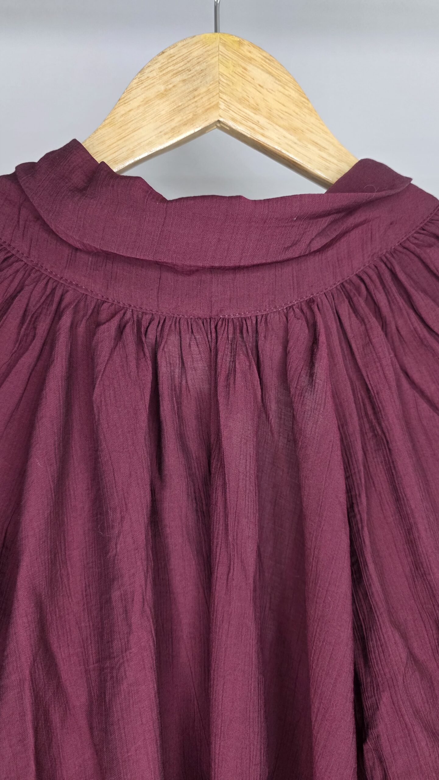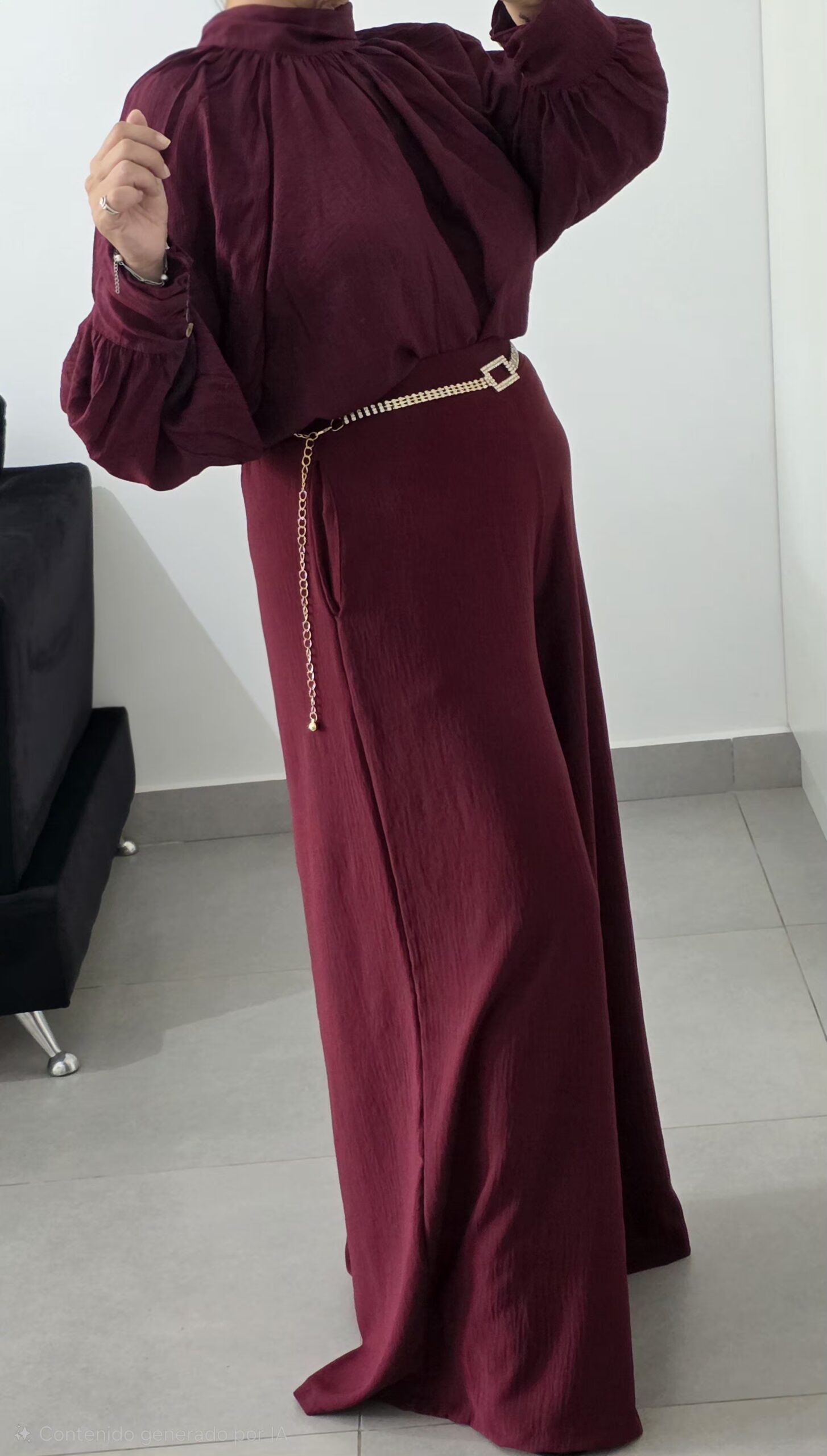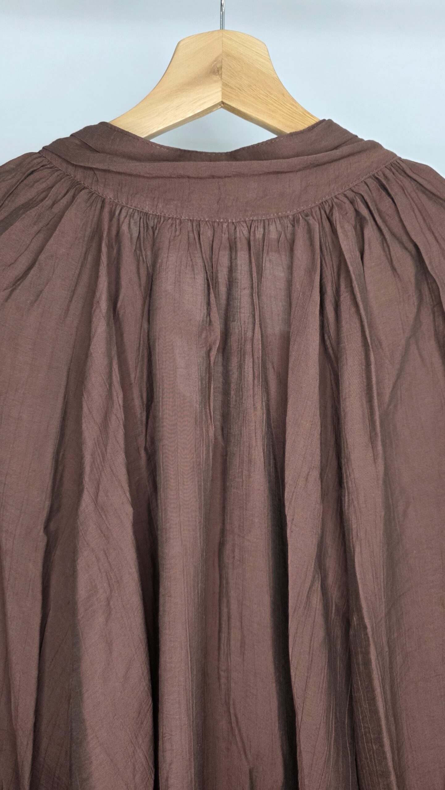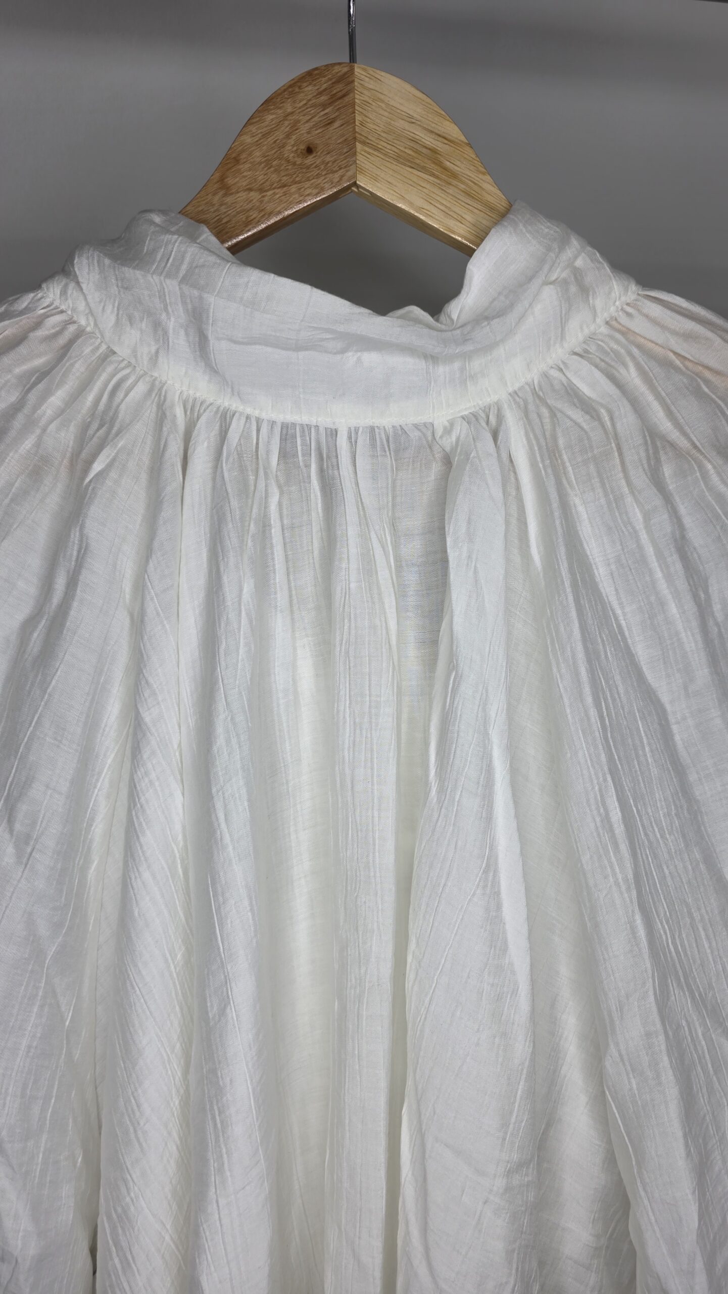 Blusa tela seda rayón,cuello media polera,mangas amplias con botones de nácar,lazo en la espalda,corte evasé,amplia
