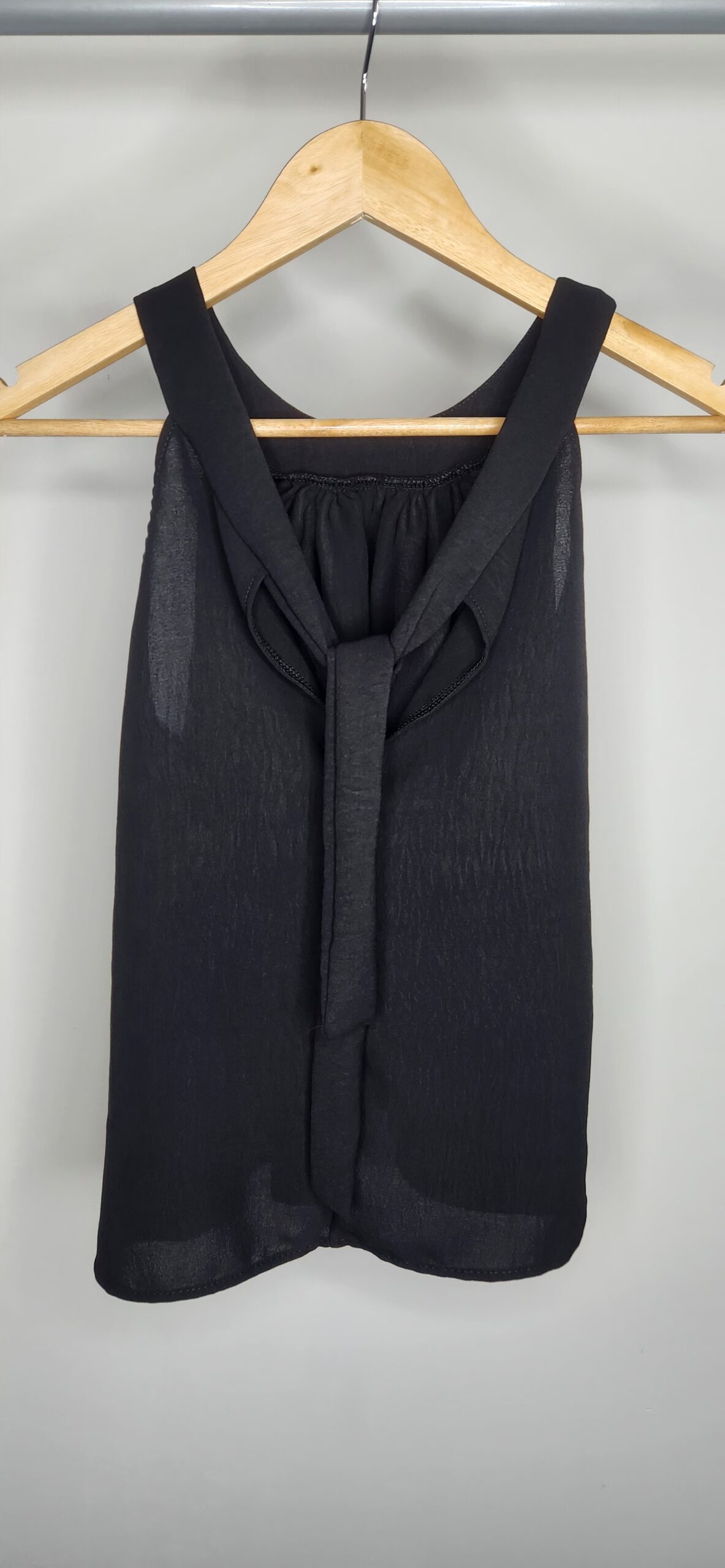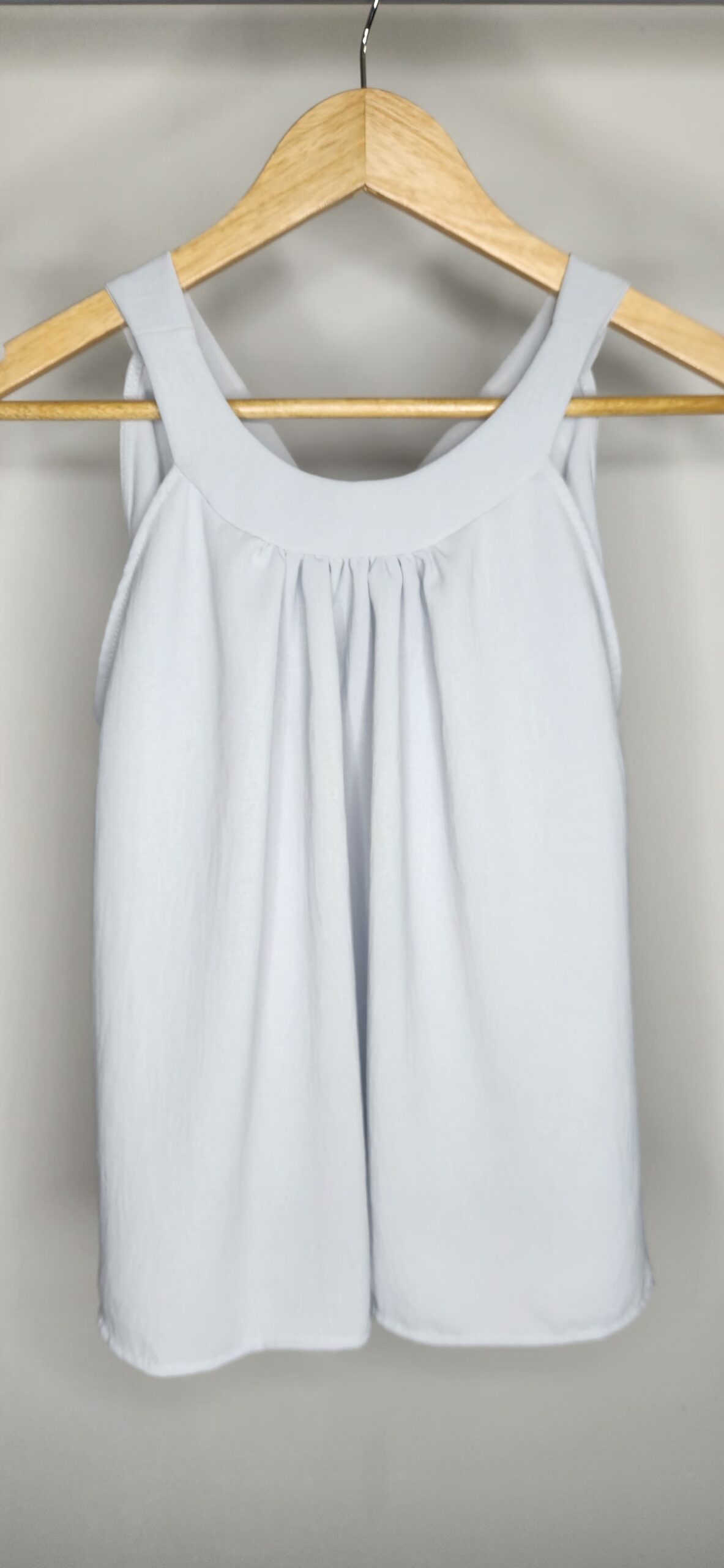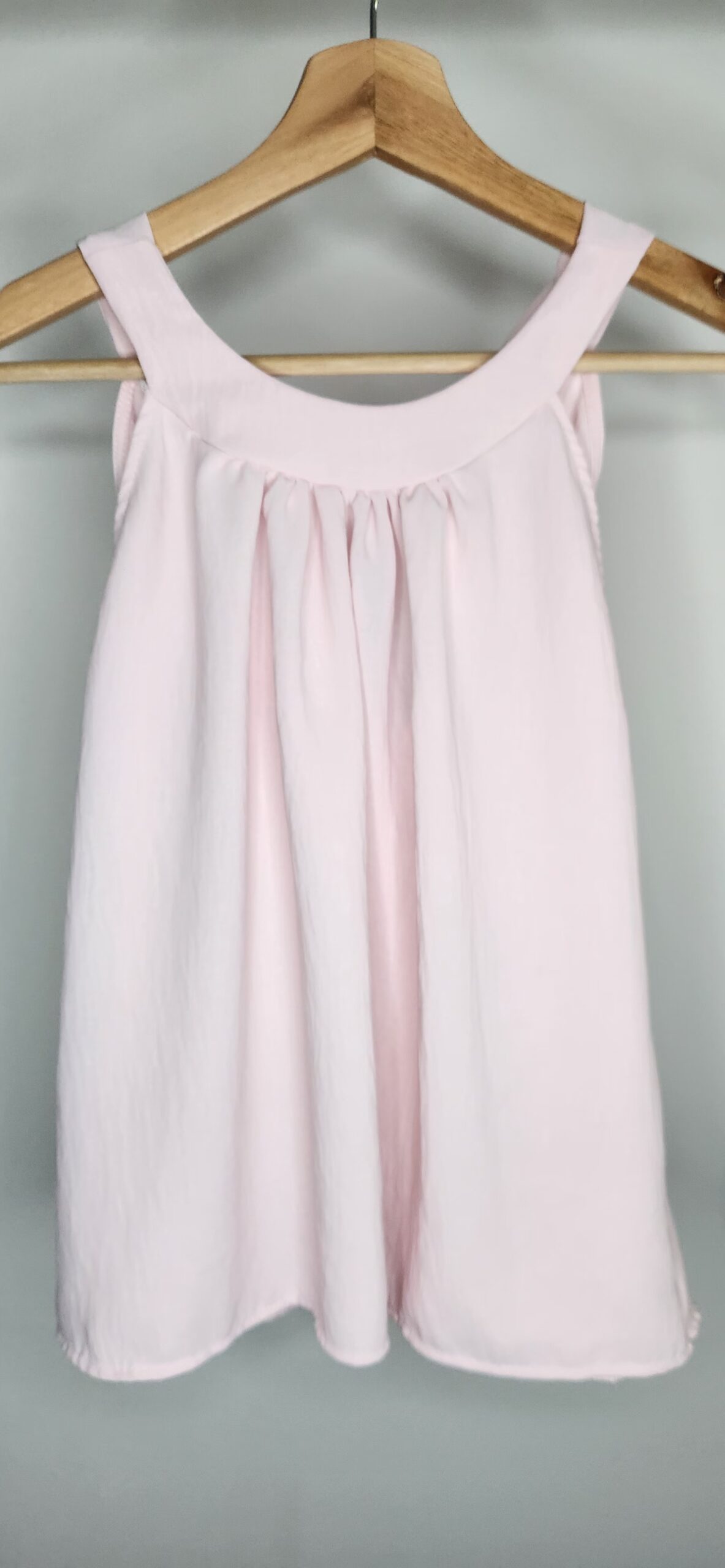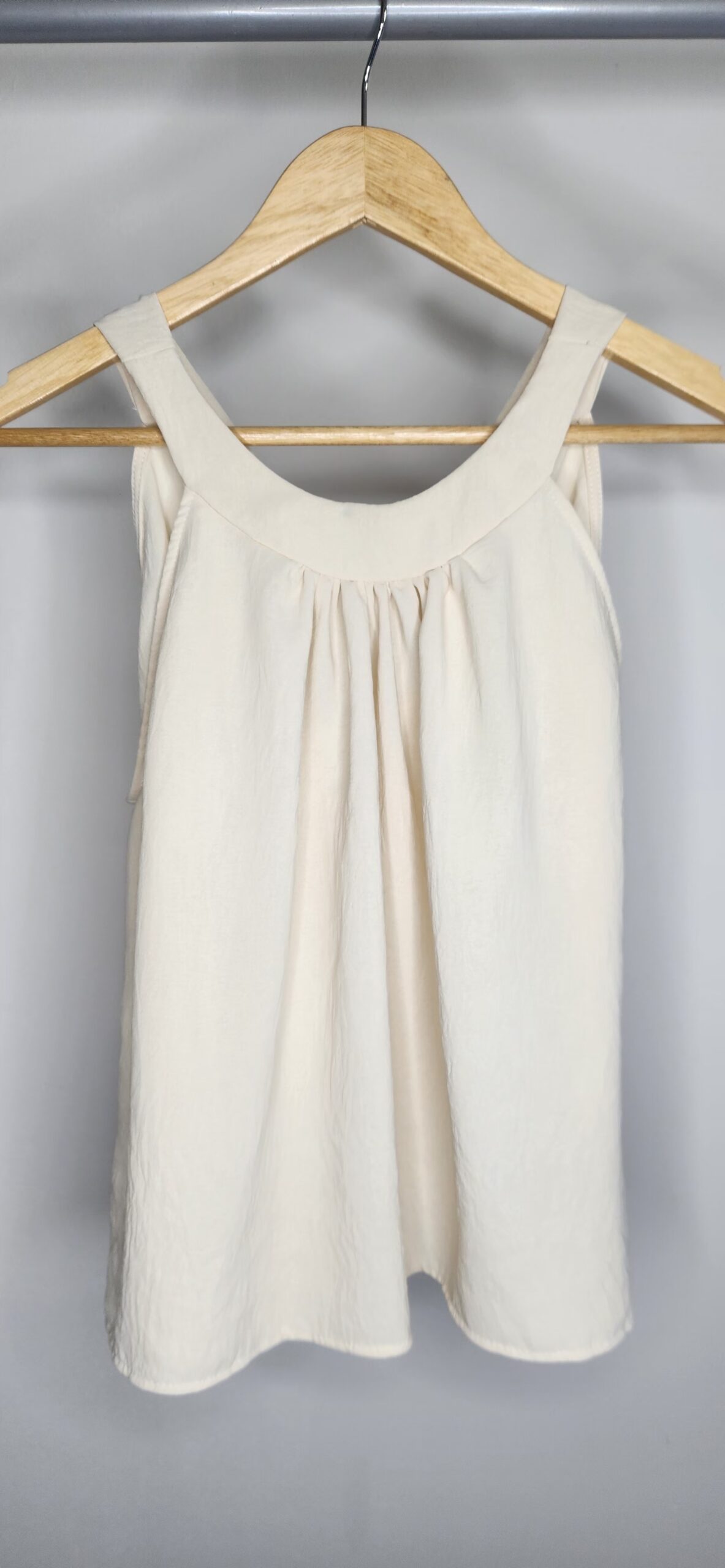Blusa de crep,cuello redondo,detalle de frunce en la parte delantera,lazo en la parte de la espalda