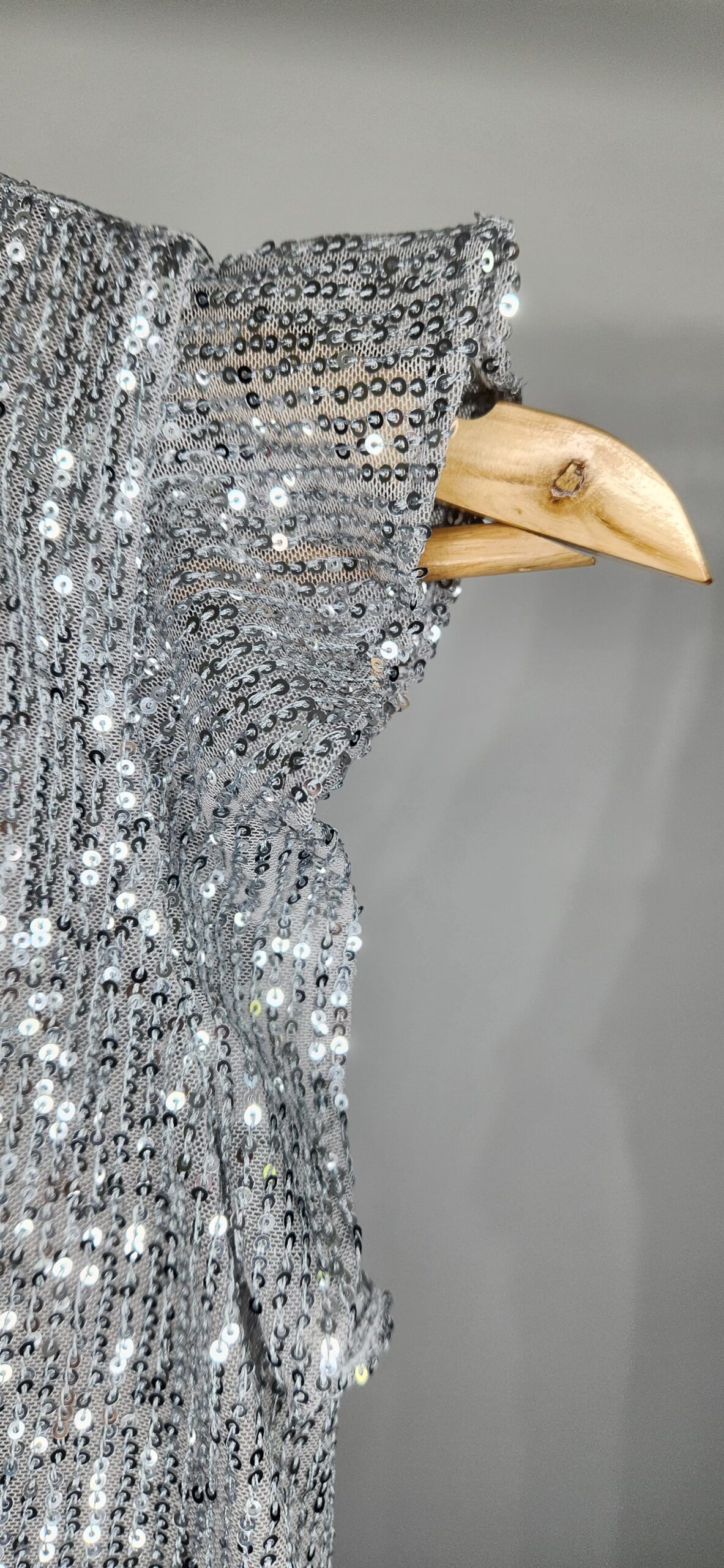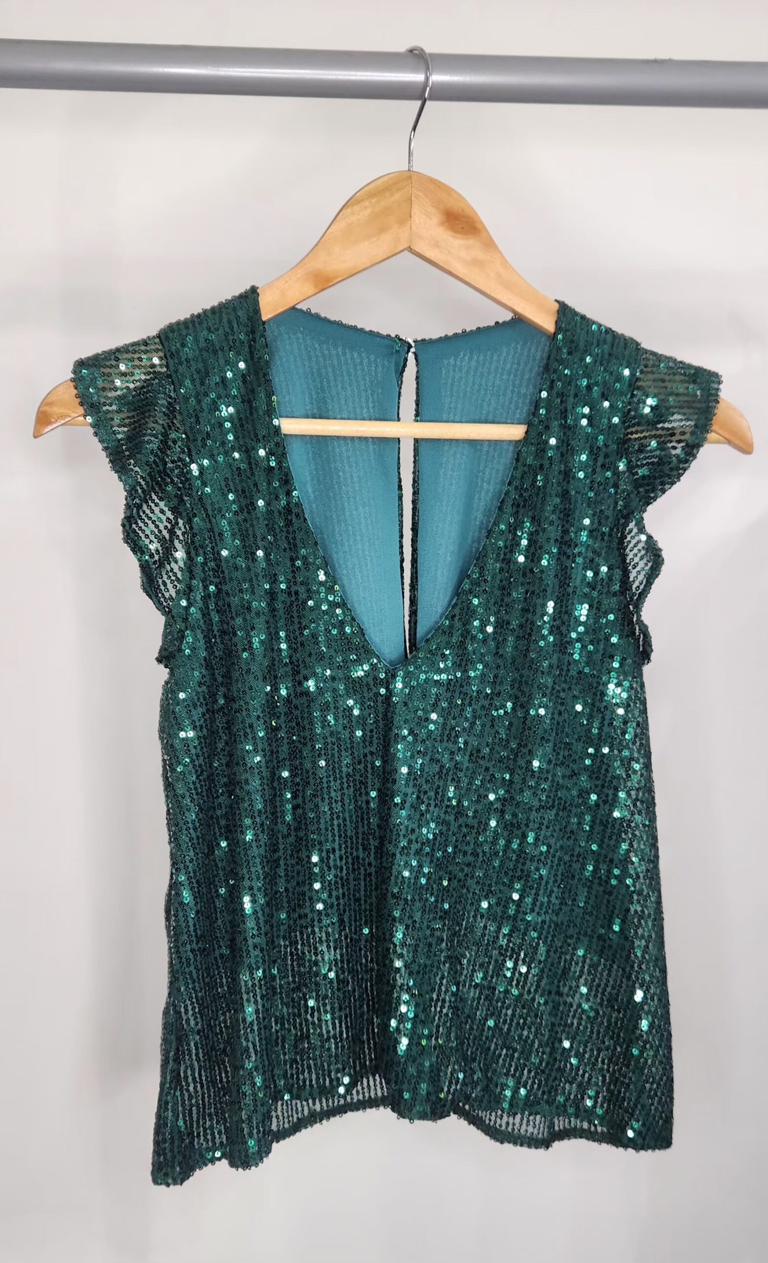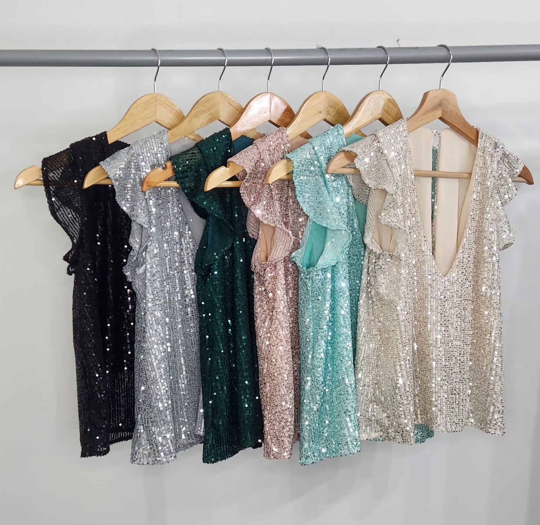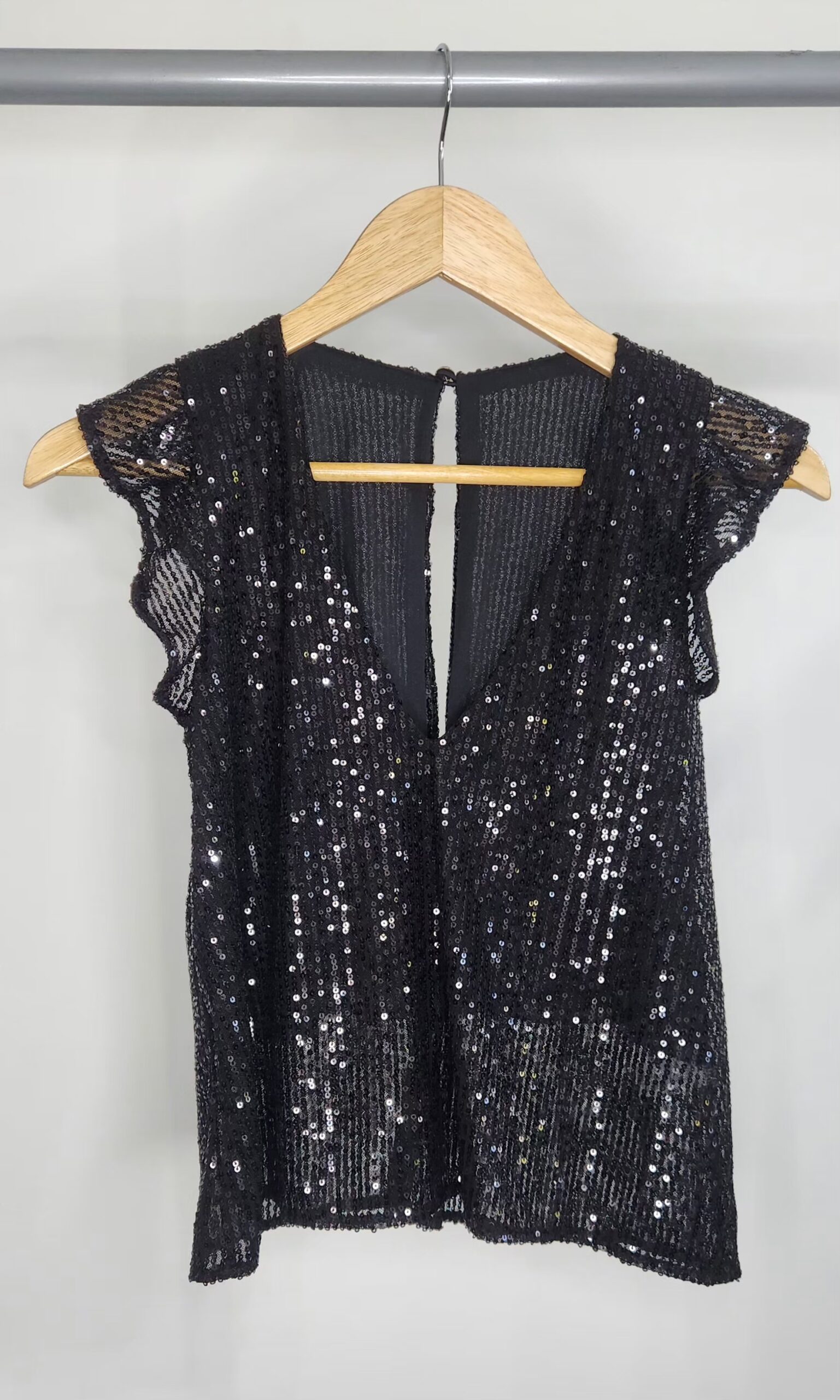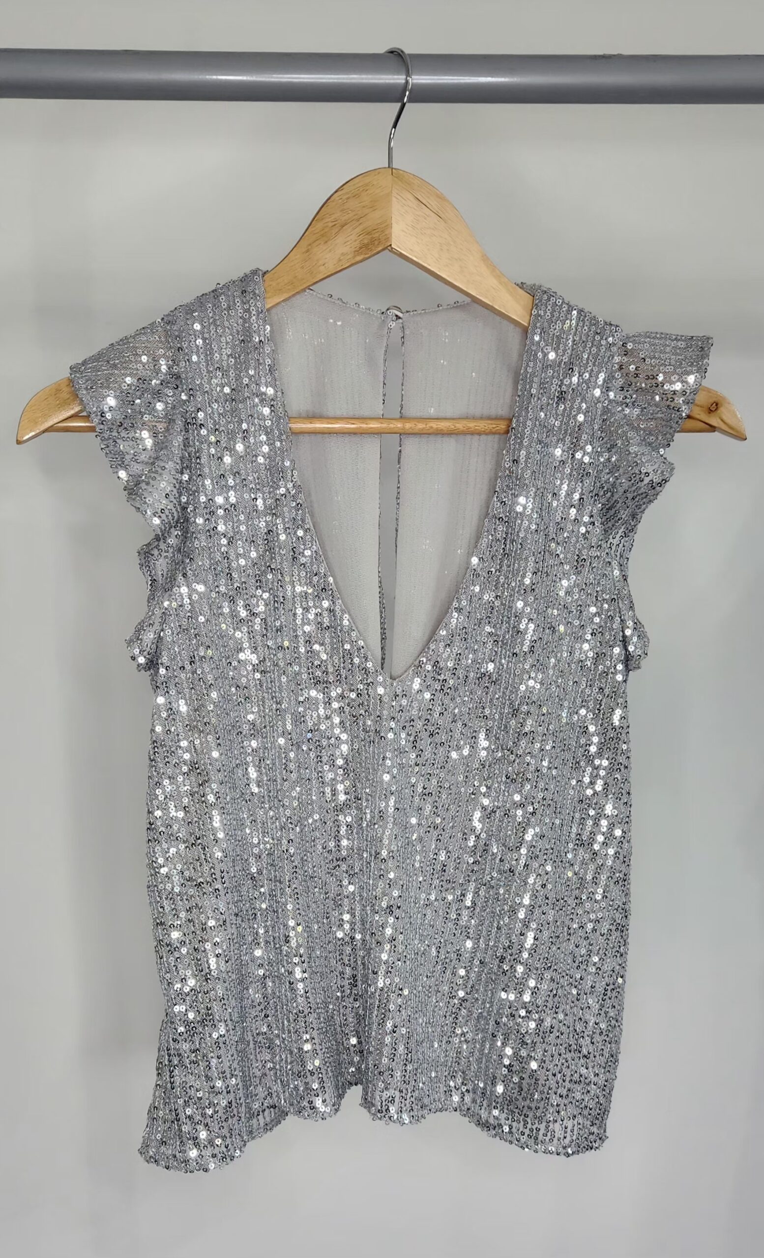 Blusa de paillettes,escote v,mangas con volados,su espalda un detalle de gota y botón en el cuello