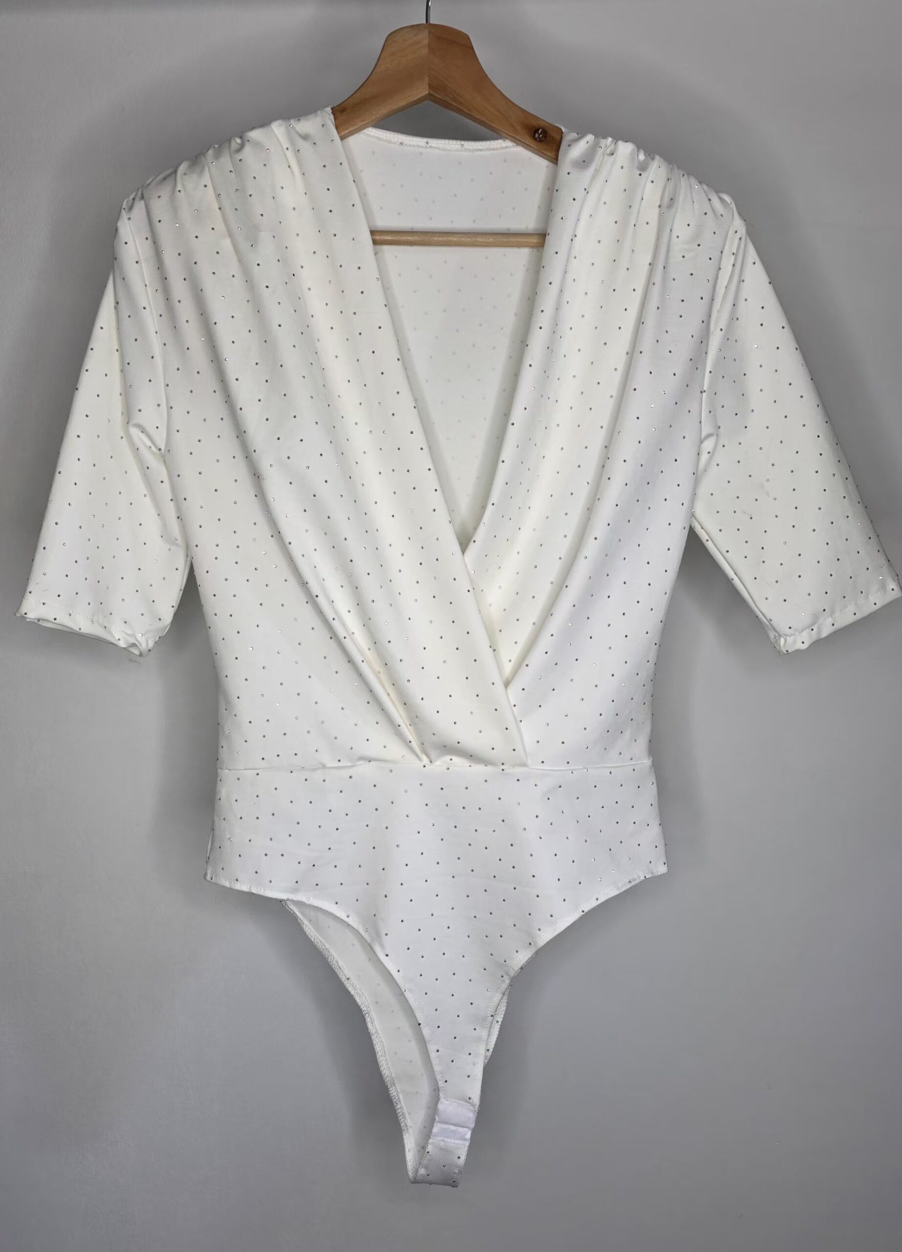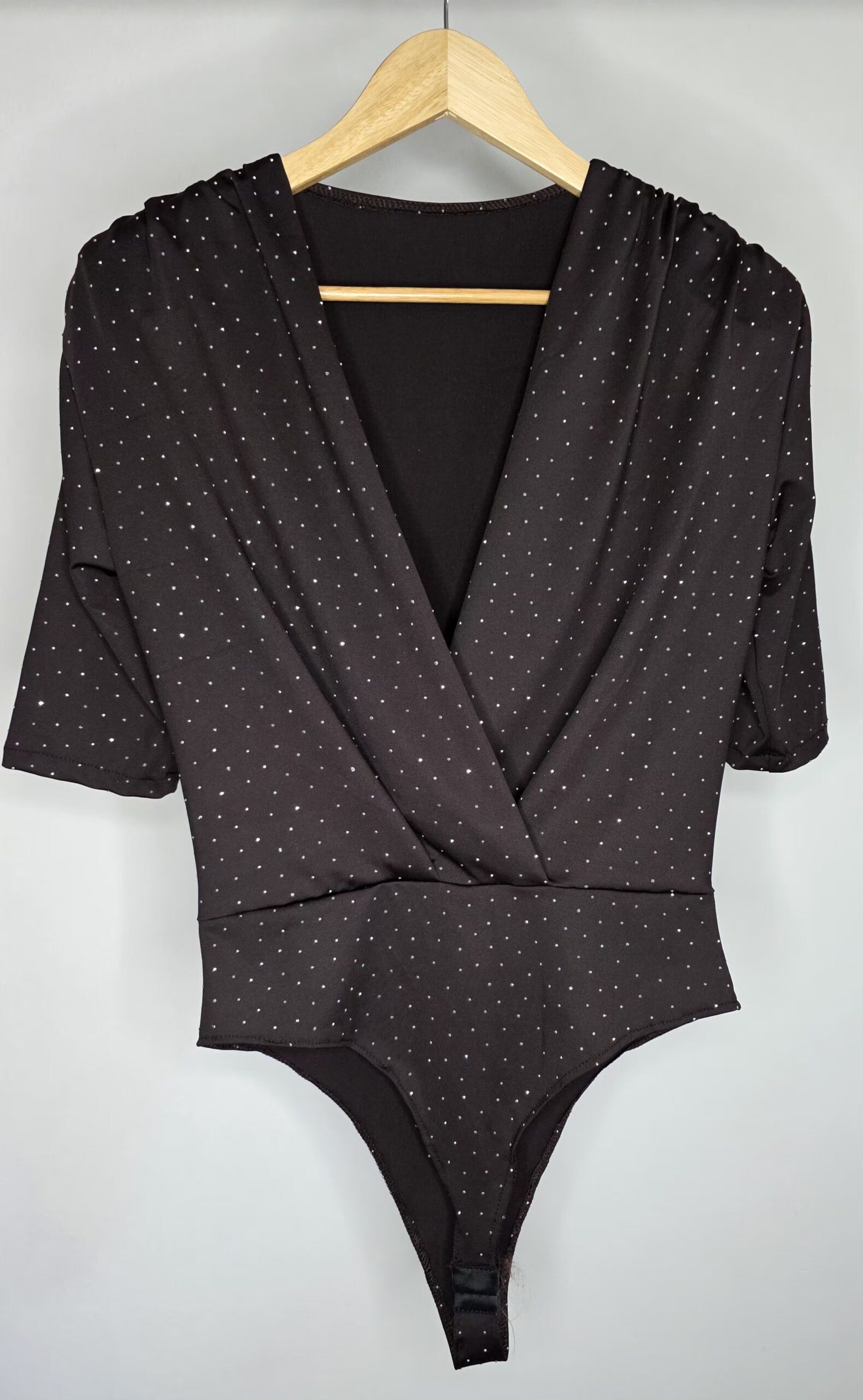 Presenta escote cruzado en V.El detalle de hotfix distribuido en toda la prenda suma brillo sutil y elegante,mangas cortas,broche en la parte inferior