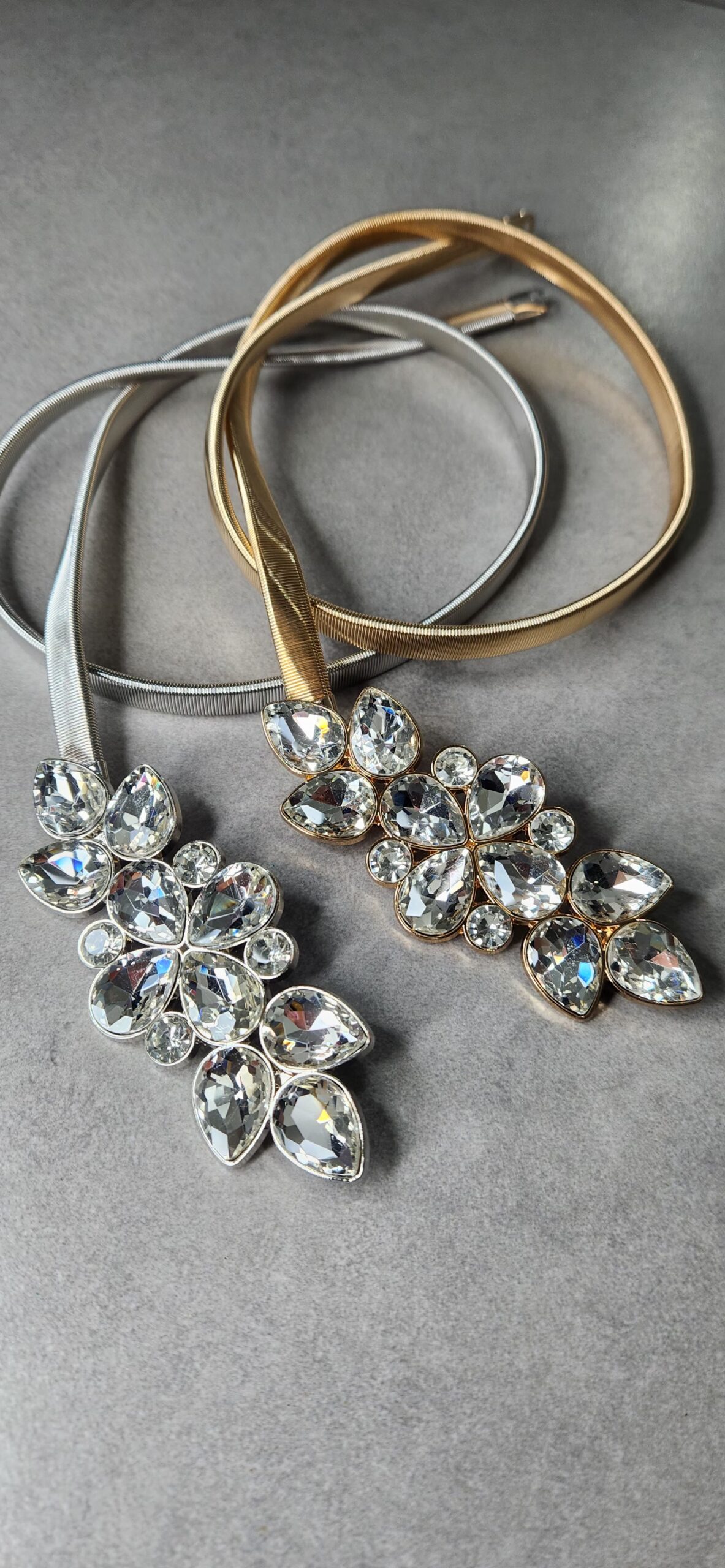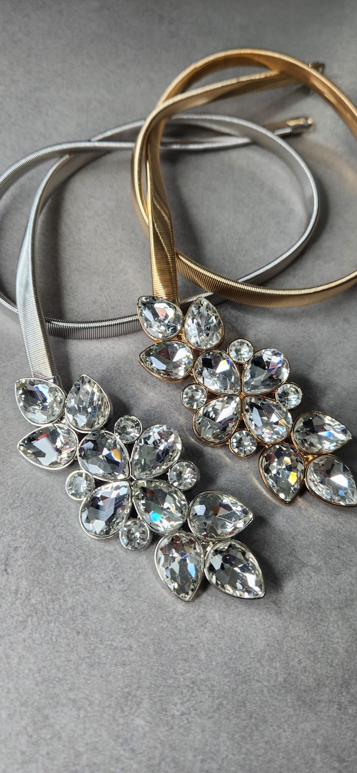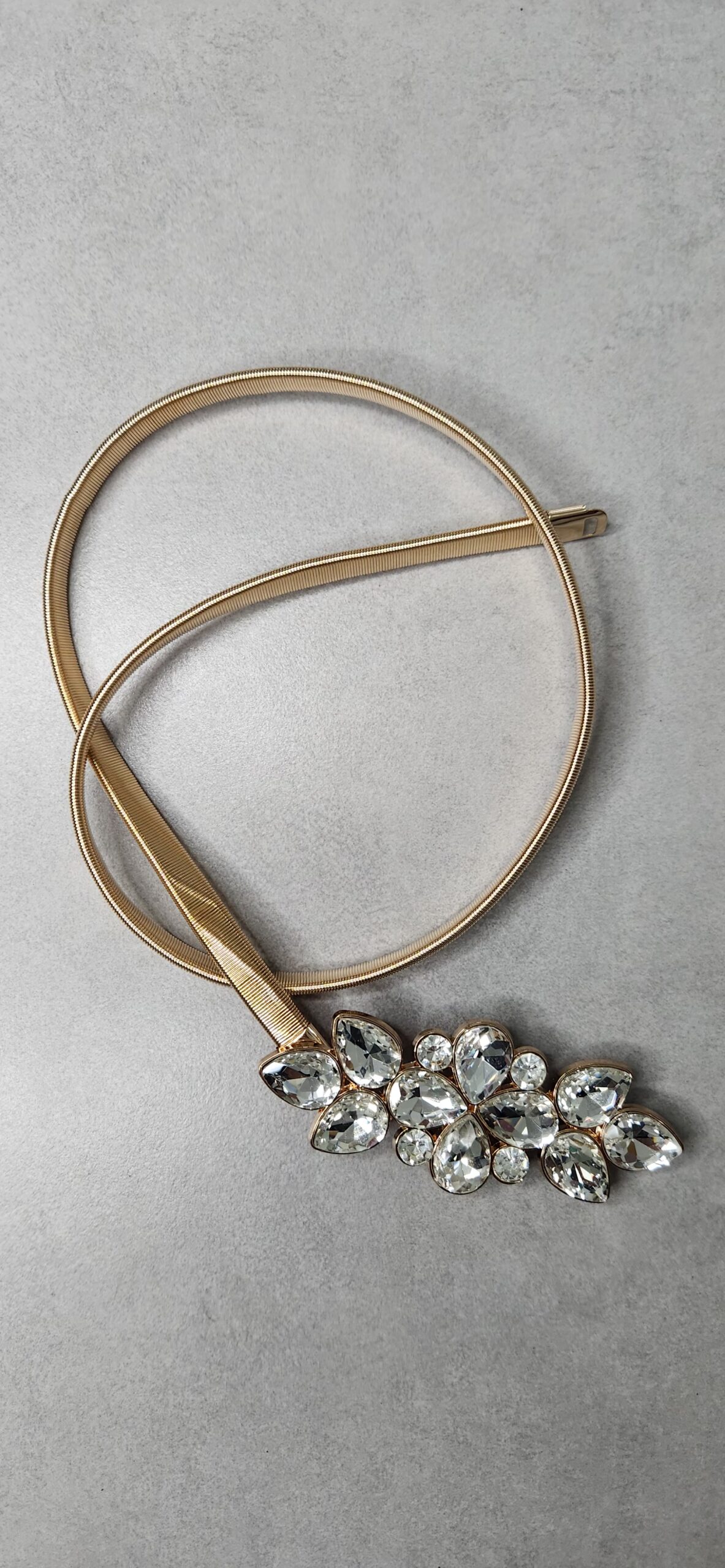 Cinturón elástico, hebilla de piedras que forma una flor con 3 pétalos de cada lado