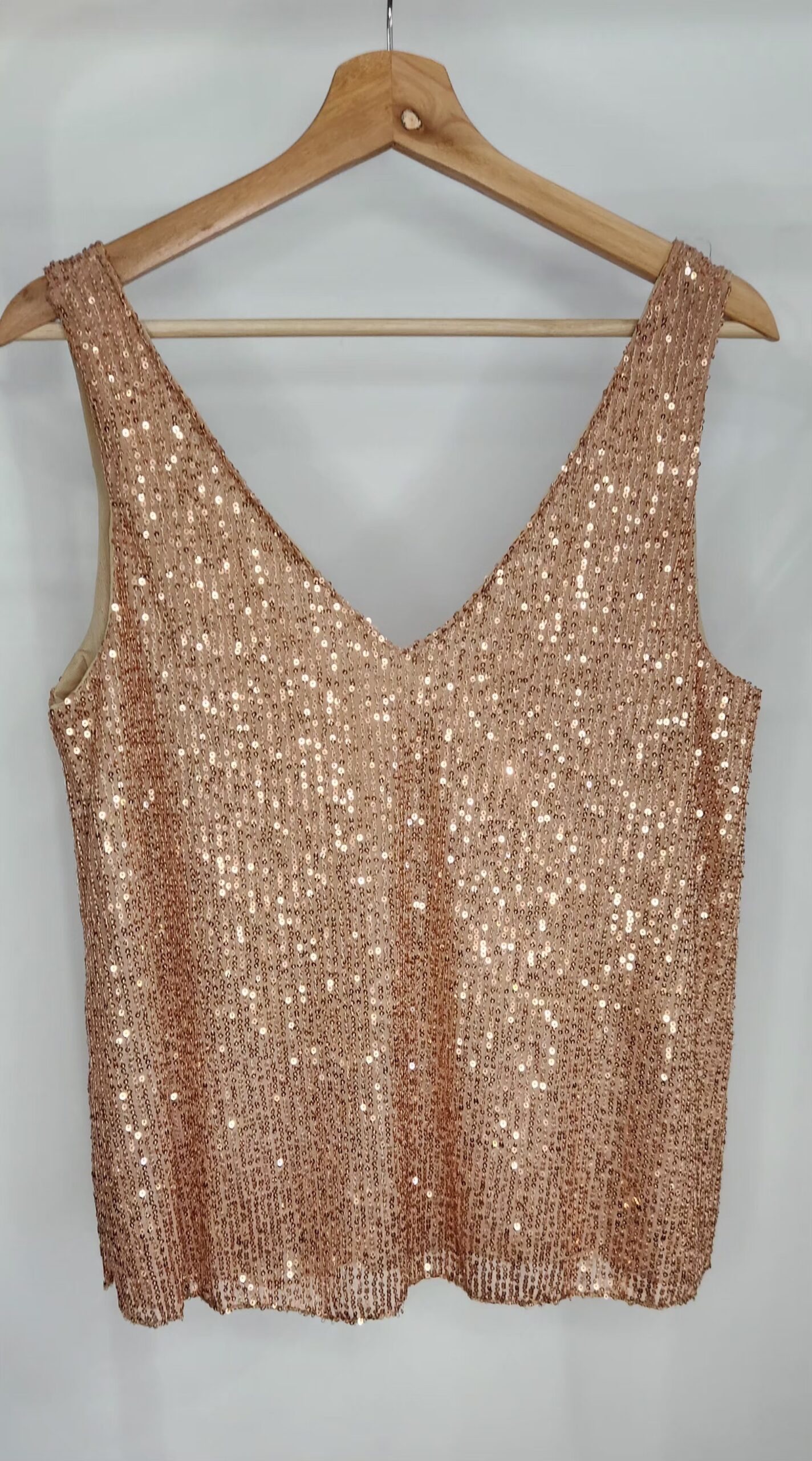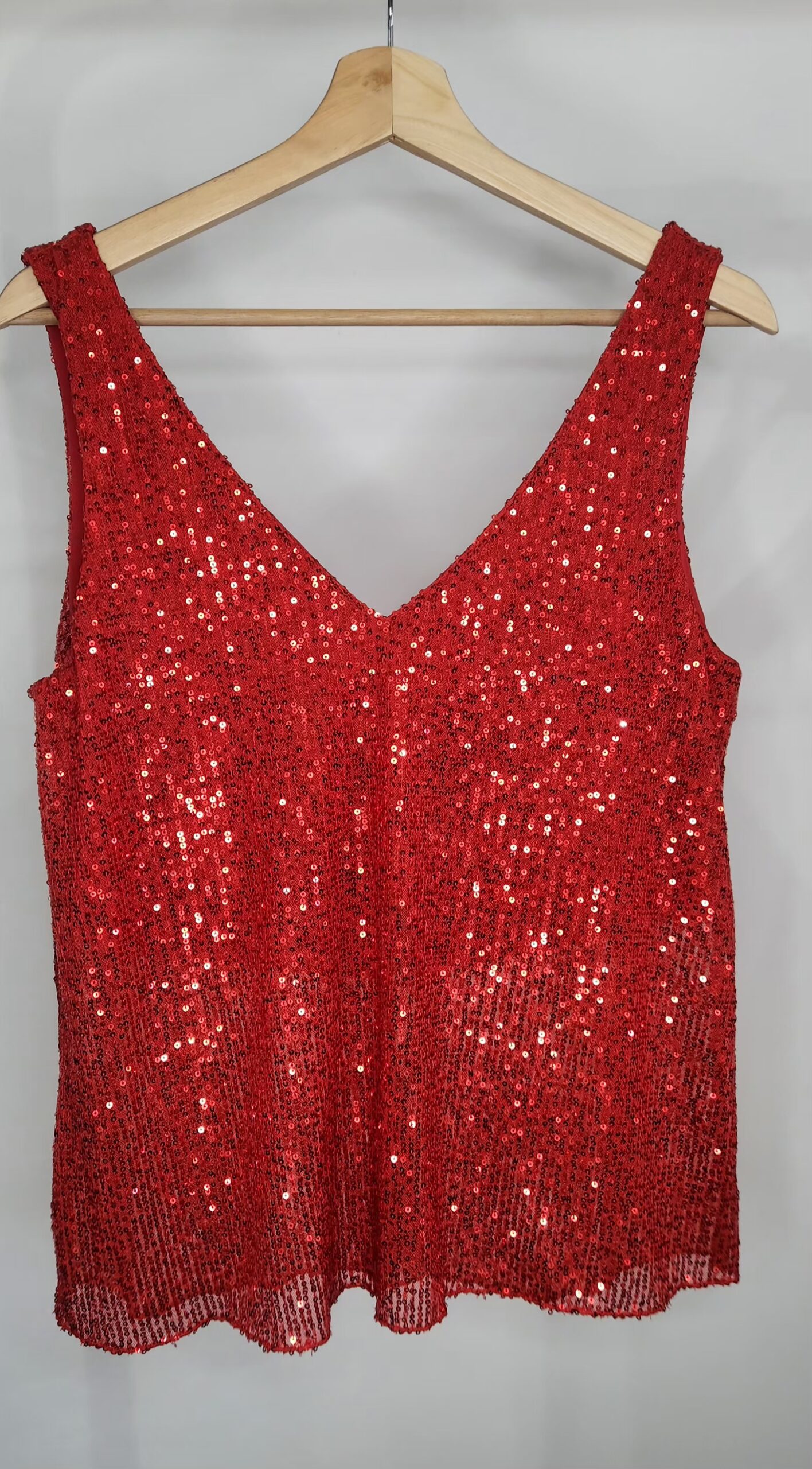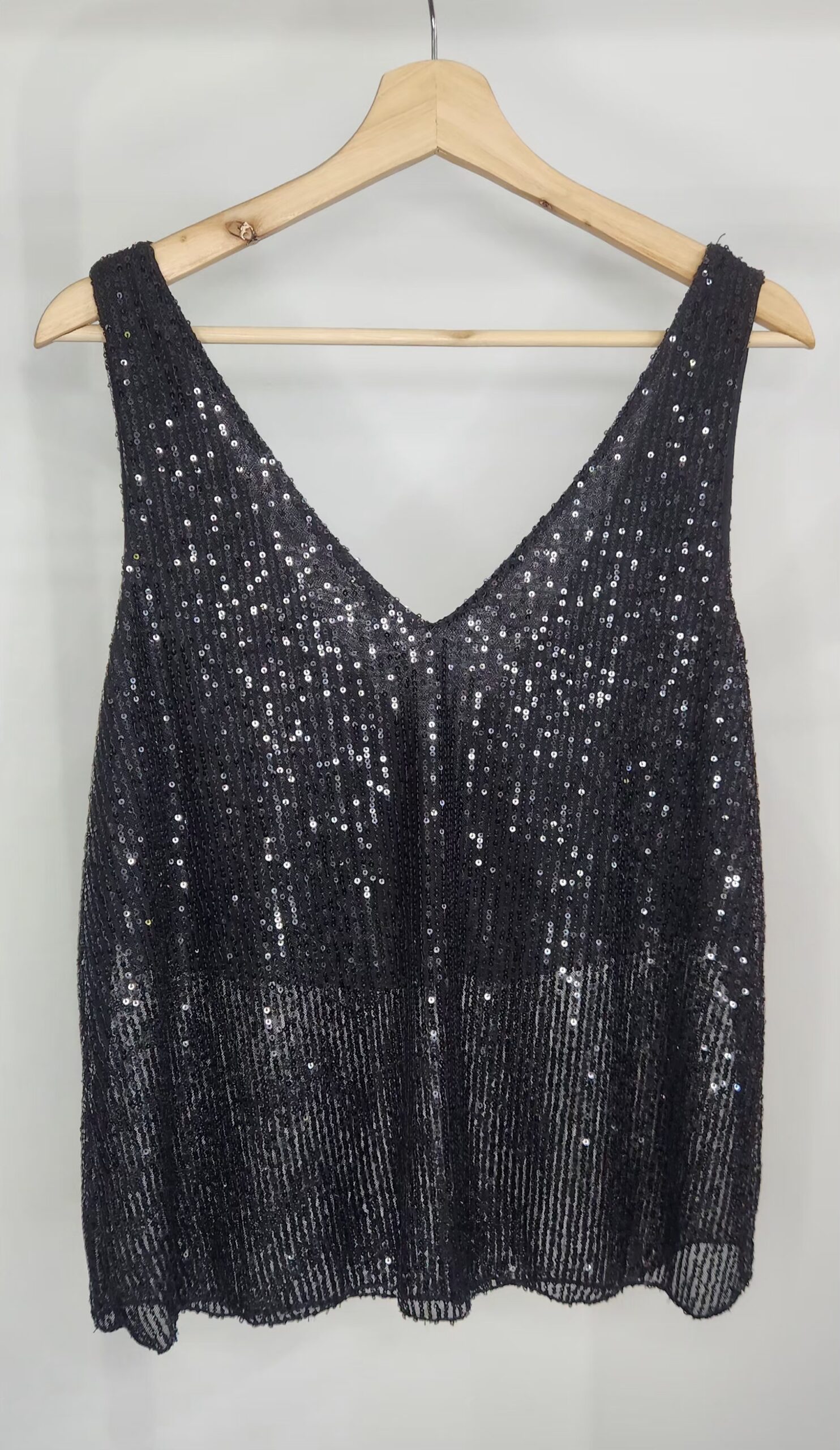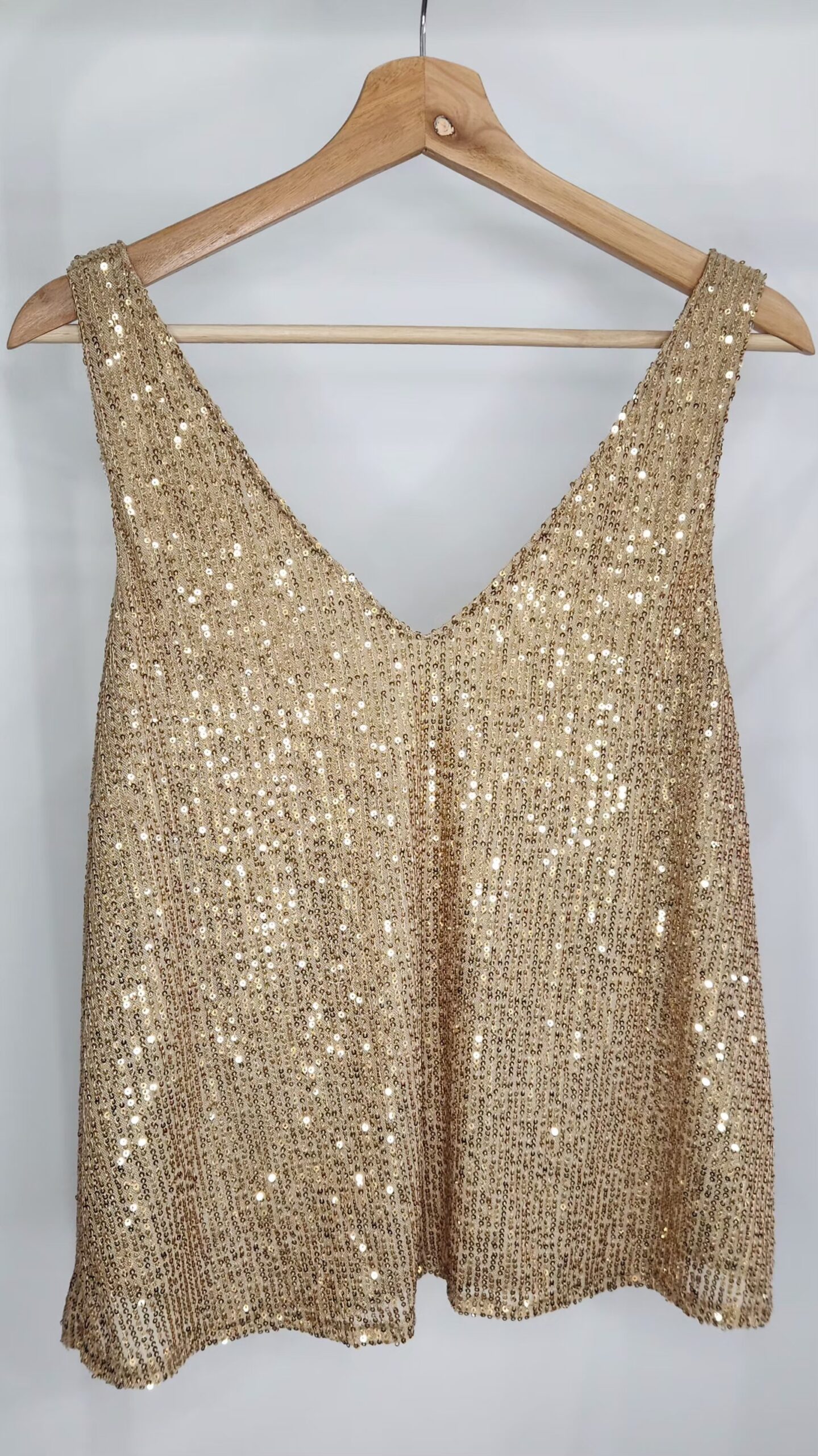 Musculosa de pailletes,escote V,corte evasé,tela con spandex,talle único