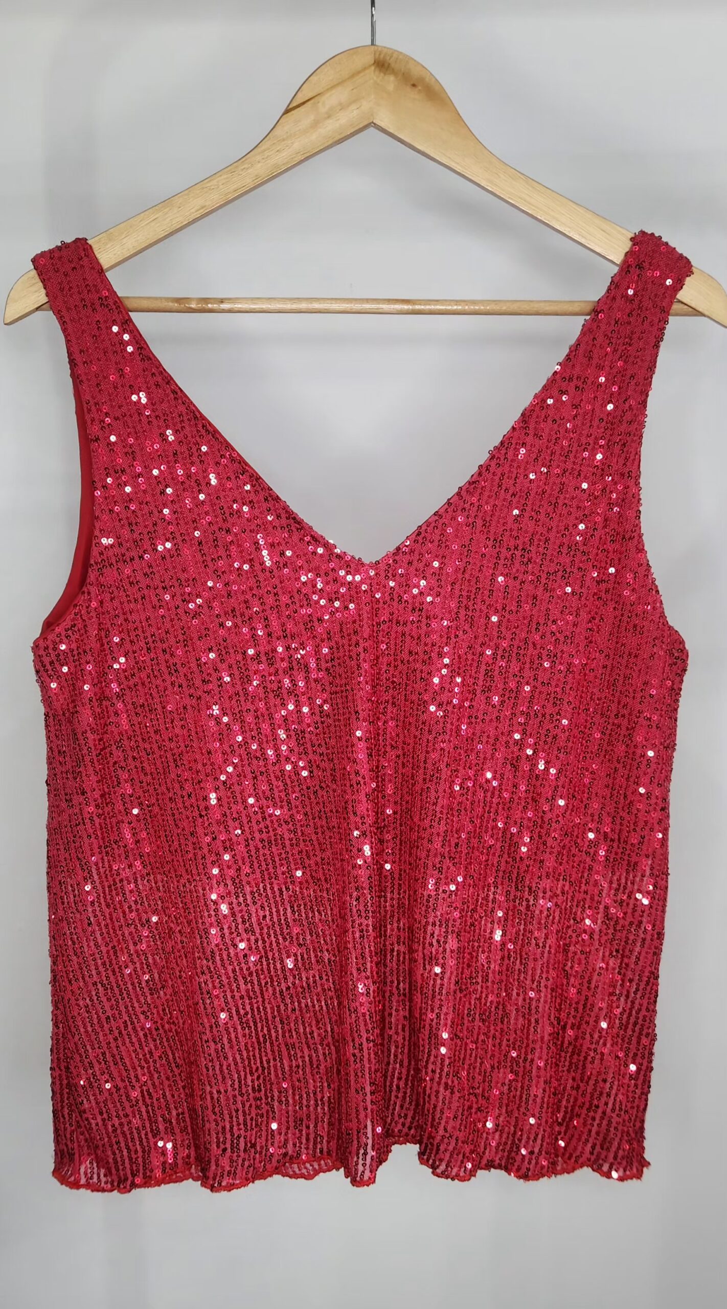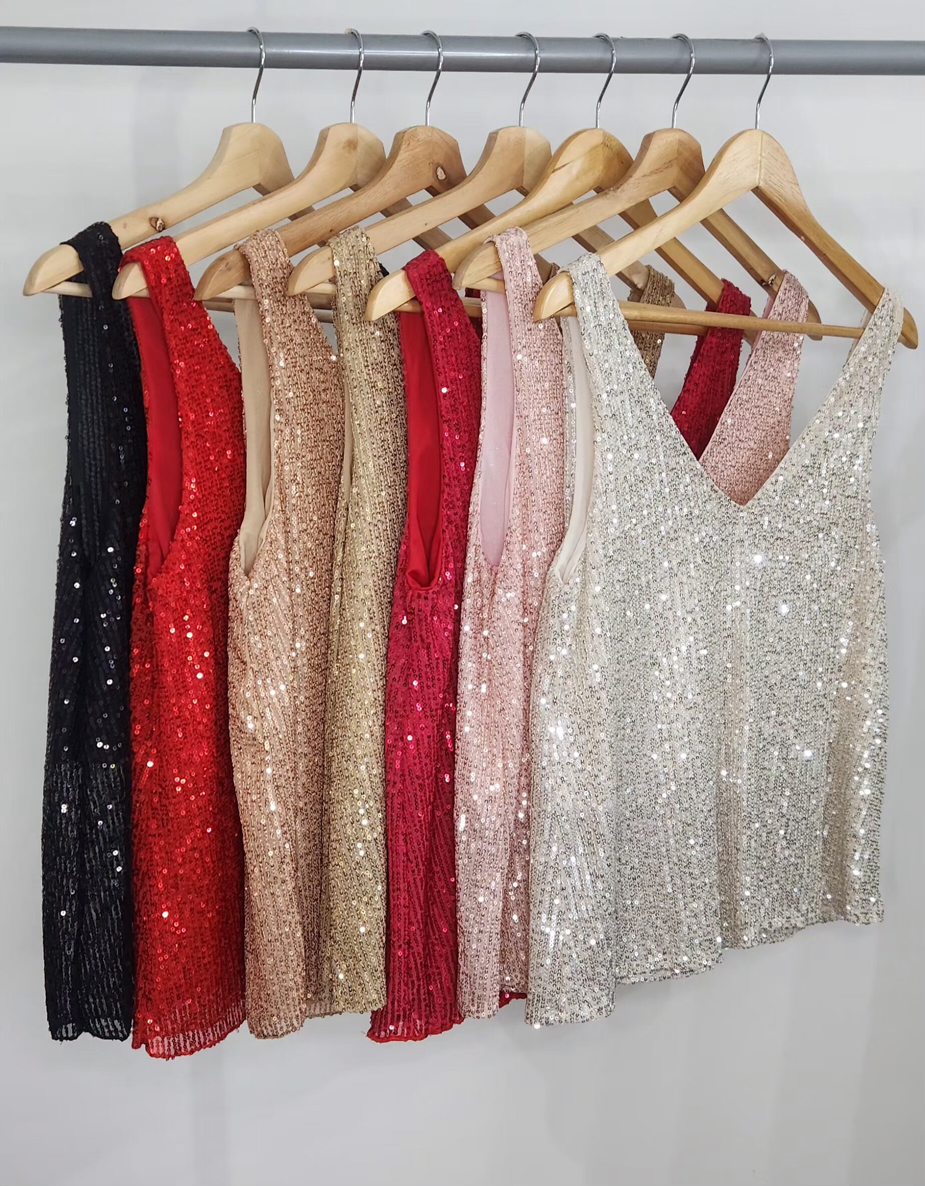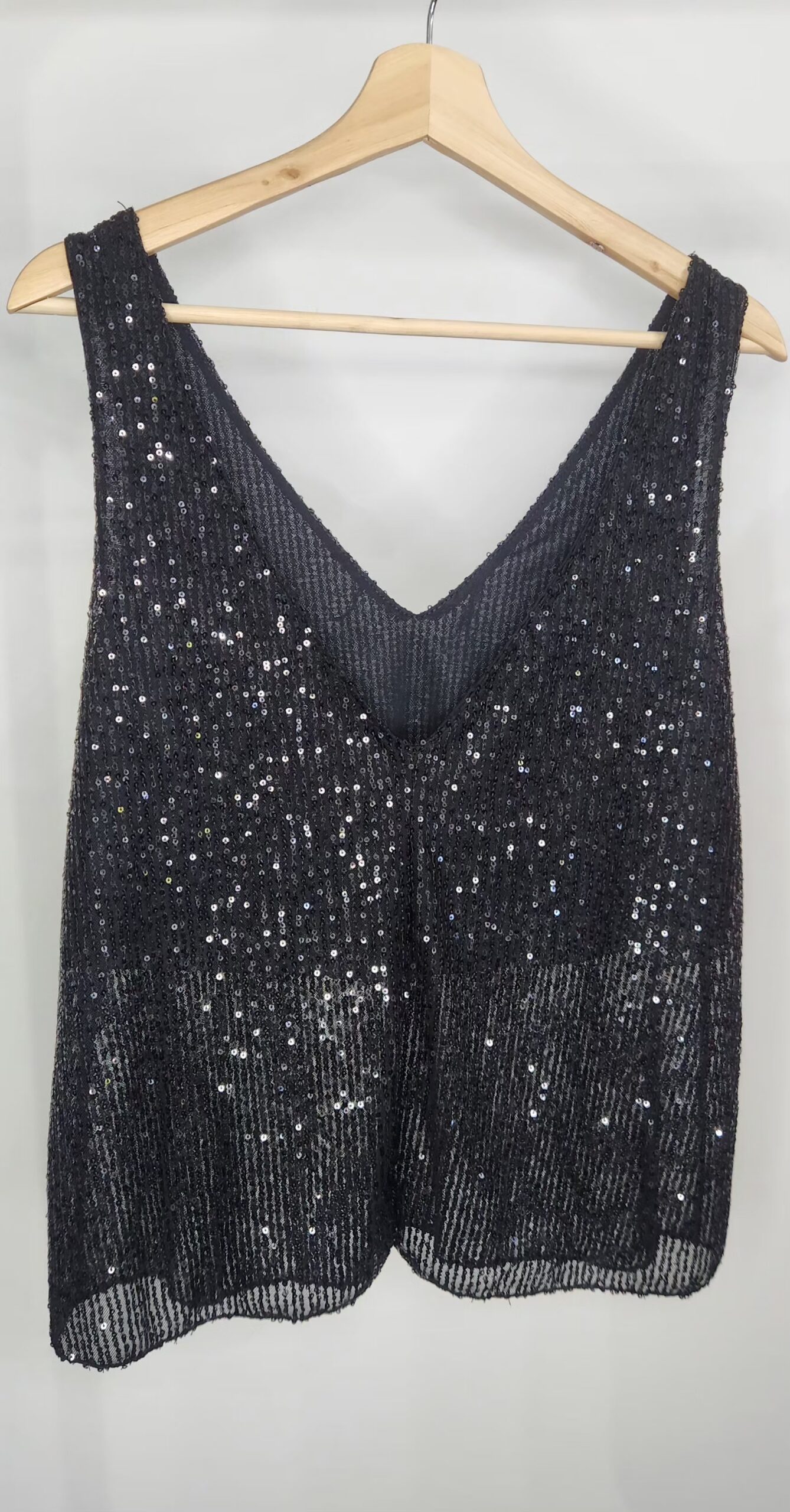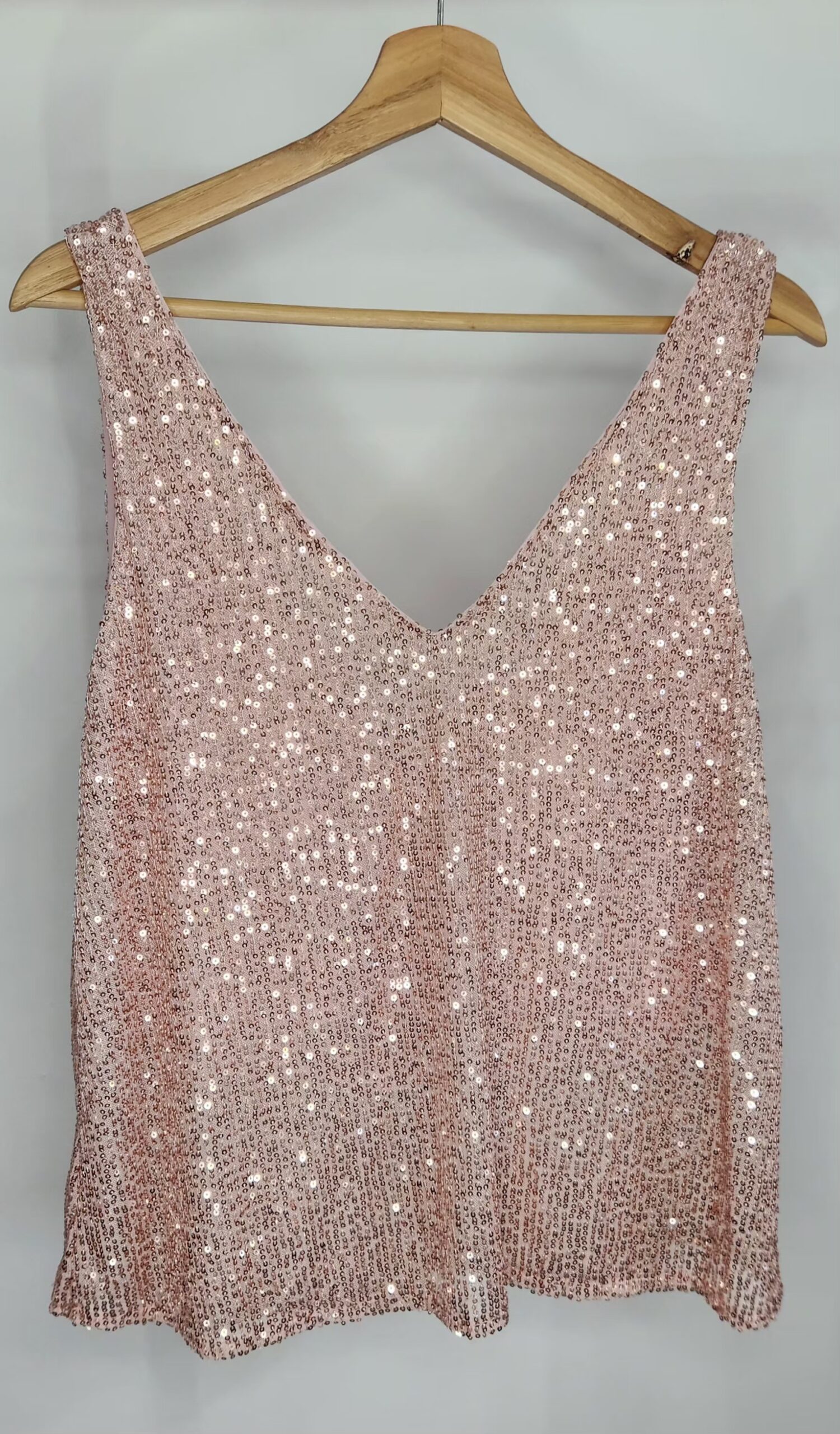 Musculosa de pailletes,escote V,corte evasé,tela con spandex,talle único